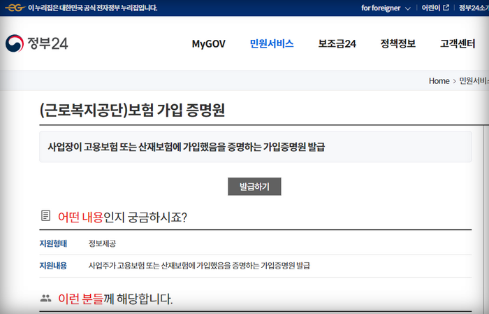 - 검색 및 신청: 홈페이지 내 검색창에 “보험 가입 증명원”을 입력하고 검색합니다. 그 후, (근로복지공단)보험 가입 증명원 발급 서비스로 이동하여 신청합니다.