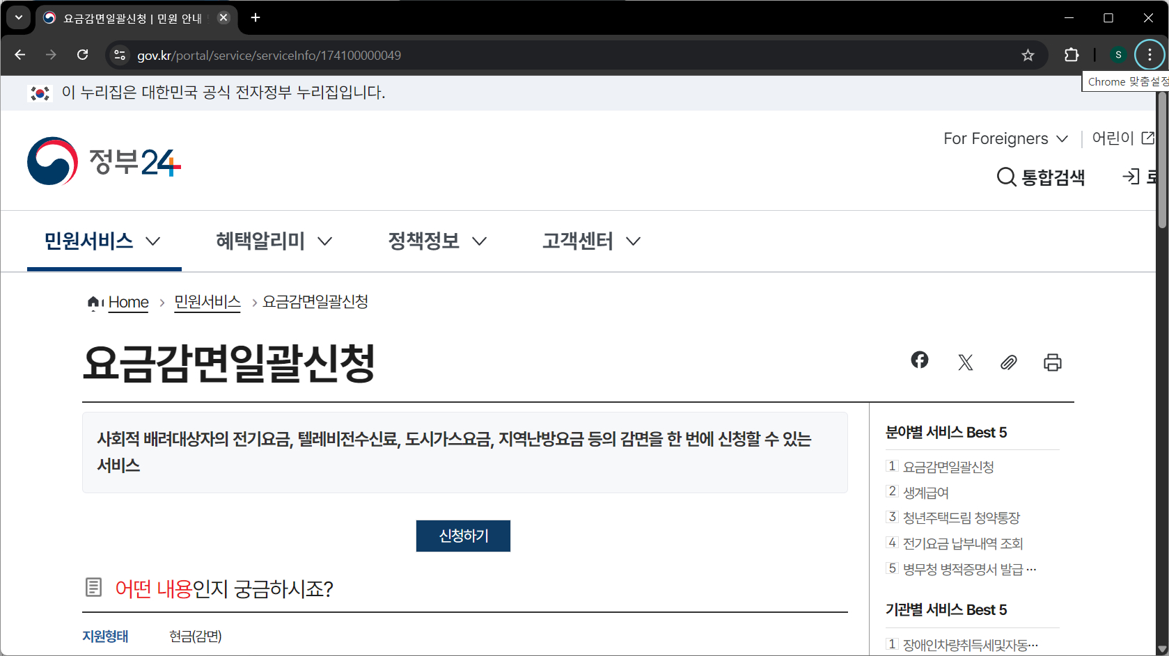- 온라인 신청: 정부24 홈페이지 로그인 후 ‘도시가스 요금 경감’ 서비스 찾기 버튼을 누르고 신청서를 작성해요.