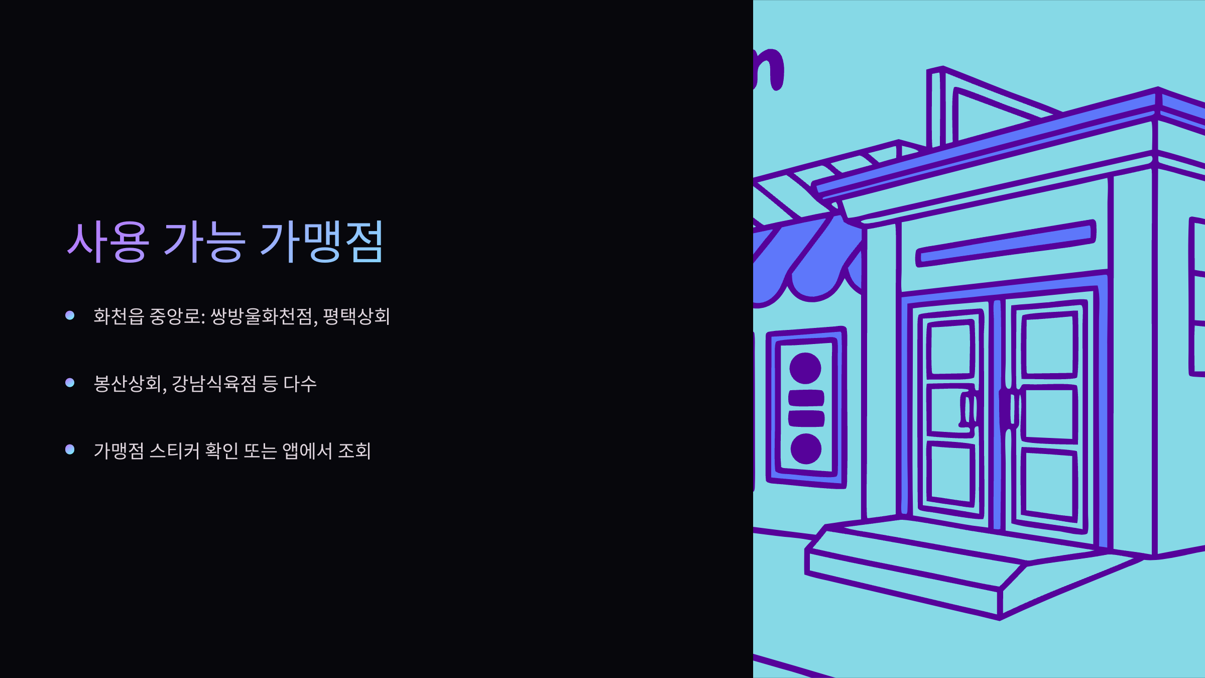 다만, 모든 업종이나 사업장이 가맹점으로 등록될 수 있는 것은 아니니, 등록이 제한되는 업종이나 사업장에 대한 구체적인 정보는 관련 조례를 통해 미리 확인해 보시는 것이 좋습니다.