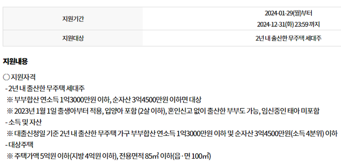 - 2년 내에 출산한 무주택 세대주가 대상입니다.